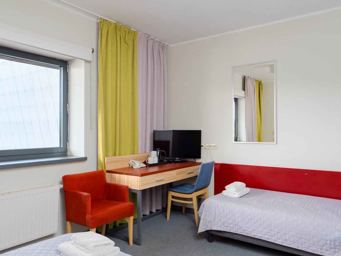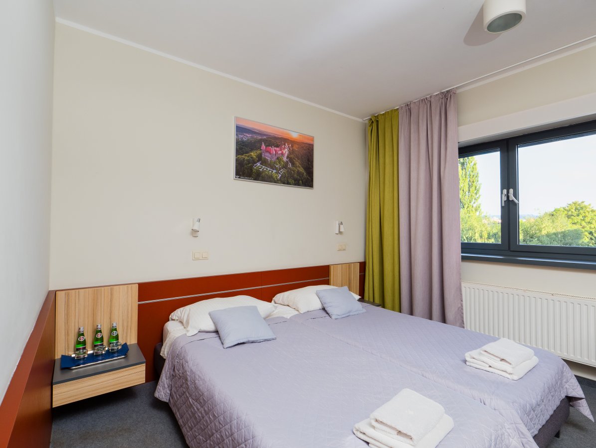 Pokój dla 2 osób, z dwoma pojedynczymi łóżkami lub łóżkiem typu queen, składający się z pokoju głównego, przedsionka oraz łazienki z prysznicem.
