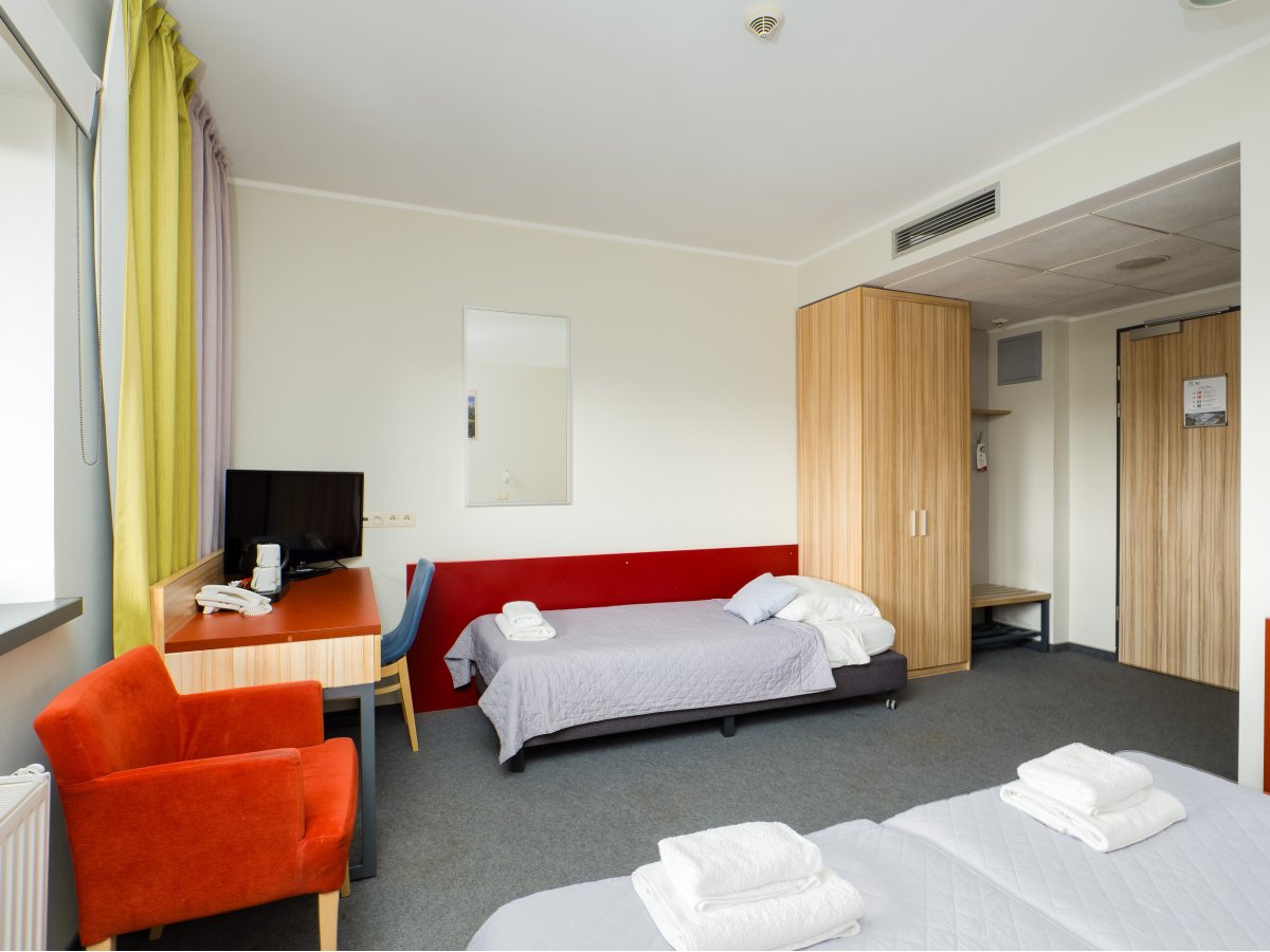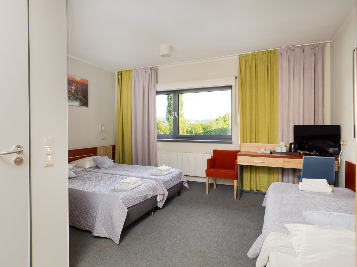 Pokój dla 3 osób, skladający się z pokoju głównego, przedsionka oraz łazienki z prysznicem lub wanną. Pokój o powierzchni 27m2, z widokiem na ...
