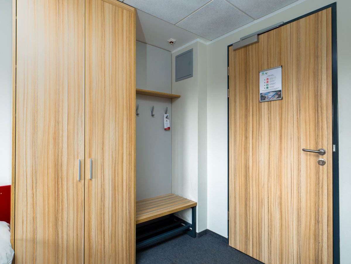 Das Zimmer für eine Person besteht aus einem Hauptraum, einem Vorraum und einem Badezimmer mit Dusche. Ein 20 m² großes Zimmer mit Panoramablick auf ...